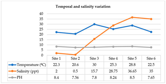 As shown in Figure 1, the highest temperature was recorded at sites 3 and 5. In addition, the salinity of the Nile water differed along its length in Giza, Cairo, and El-Delta provinces. These variations in salinity categorize the Nile water spatially into three different salinity zones: fresh (0.5–2 ppt), brackish (2–15 ppt), and marine (>15 ppt). At site 3, there was a salinity shift of Nile water from the fresh to the brackish side, and the elevation continued in a seaward direction to the Mediterranean Sea Nile outlets, where the highest values of salinity were recorded at sites 4, 5, and 6, along the coastal line of the sea. The pH range was toward the alkaline side (7.56–8.5), with slight local differences but no distinct temporal variations observed.