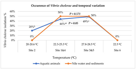 With regard to temporal variation (Figure 2), the occurrence of V. cholerae in water and sediment samples during hot temperature was higher than in other zones. No cholerae were detected in examined water samples collected from either site 2 or 6. Meanwhile, there was a significant noticeable association between temperature increase and the occurrence of V. cholerae in the examined finfish and seafood crustacean samples, χ2(2, N = 185) = 5.95, p = 0.05.