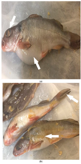 Regarding the ecoepidemiology of V. cholerae and aquatic animal reservoirs, we noted a different pattern of cholerae occurrence among the examined aquatic animals. Clinical examination of freshly caught finfish and crustacean seafood samples revealed that all were apparently healthy, except for Synodontis schall fish samples. Fish samples collected from site 3 had evident clinical signs related to septicemic bacterial infection (Figure 3a,b, arrows). These symptoms included ascites, eye opacity, edema and discoloration of the gills, and skin lesions. Postmortem examination of the fish species revealed signs of swelling of the internal organs, liver, spleen, and kidney. The fish were found to have abdominal dropsy.
