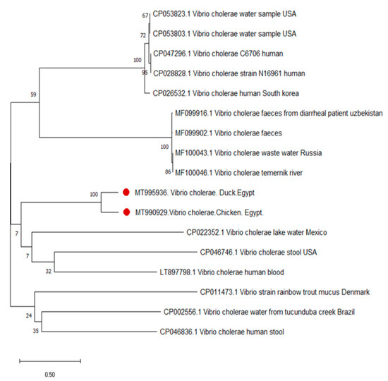 The epidemiology of V. cholerae relies on multifactorial environmental and social actions. Thus, organic fertilization of aquatic pond farms with animal and poultry wastes, sewage, and municipal wastewater could increase the possibility of V. cholera transmission to inhabited fish and crustaceans (environmental reservoirs). However, in addition to the individuals involved in animal farm activities, humans can be infected through unhygienic handling, processing, and/or consumption of fish, shellfish, and their products at the domestic, commercial, or household level [17,18,19,20,22]. Our study sequences are also found in the same cluster as human sequences. This result highlights the zoonotic potential of V. cholera that could be transmitted to humans directly through wild aquatic birds [23] or indirectly through environmental dissemination [24].