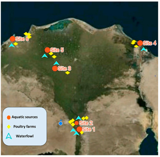 A surveillance study was conducted on the surface water bodies and fisheries located along the length of the Nile River in Giza, Cairo, to Delta provinces, Egypt, from which the different aquatic samples were collected during different seasons (from March 2019 through May 2020). In addition, poultry samples were collected from different poultry farms located within the same geographical zones in Giza and the Nile Delta, different districts from Port Said to Alexandria, approximately 1000 km along the middle coastal lines of the Mediterranean Sea (Figure 5).