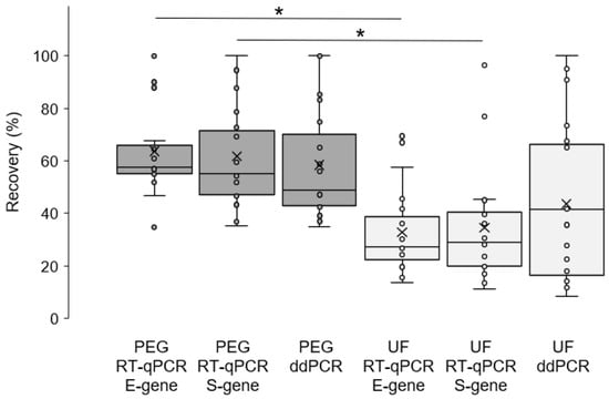 SARS-CoV-2 recovery in spiked wastewater samples using polyethylene glycol/NaCl precipitation (PEG) and ultrafiltration with Vivaspin columns (UF). RT-qPCR—real time quantitative PCR. ddPCR—droplet digital PCR. * statistical significance (t-test, p < 0.05).