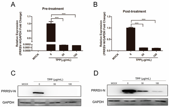 Since TPP plays a powerful role in inhibiting PRRSV (Figure 1), we next treated Marc-145 cells with TPP before or after PRRSV infection to further explore the influence of TPP on PRRSV. The results showed that PRRSV was effectively inhibited when cells were pre-treated with TPP for 2 h and then infected with PRRSV for 24 h (Figure 2A,C). In the post-treatment assay, TPP also showed a potent inhibitory effect on the mRNA and protein levels of PRRSV N (Figure 2B,D). These data demonstrate that TPP restrains PRRSV replication regardless of its pre-treatment or post-treatment.