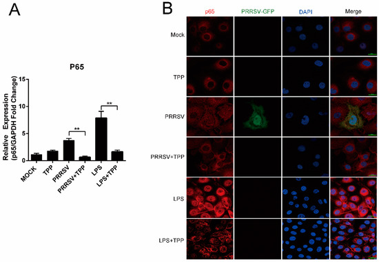 2.4. TPP Treatment Reduces the Expression of p65 and Impairs p65 Transport into the Nucleus after PRRSV Infection