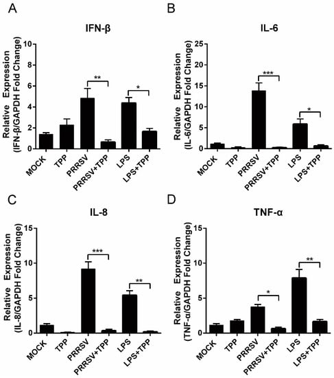 Expression of cytokines in Marc-145 cells treated with TPP. (A–D) Marc-145 cells were mock-infected or infected with PRRSV-CHR6 (MOI = 0.6) in the presence or absence of TPP (50 μg/mL) for 12 h. The expression of pro-inflammatory cytokines IFN-β (A), IL-6 (B), IL-8 (C), and TNF-α (D) was analyzed using qRT-PCR. Relative expression (fold) in comparison with mock-infected cells (set up as 1) is shown. LPS served as a positive control. Data are the results of three independent experiments (means ± SE). Significant differences between PRRSV-infected cells and those treated with TPP are denoted by * p < 0.05, ** p < 0.01, and *** p < 0.001.