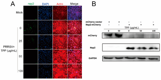 The PRRSV nsp2 gene was amplified from the PRRSV-CHR6 strain and cloned into vector pmCherry-N (632523, Takara, Kusatsu, Japan) with a C-terminal mCherry tag. Marc-145 cells (2 × 106 cells/well) were seeded in six-well plates. The mCherry-tagged nsp2 plasmid was transfected into Marc-145 cells for 6 h, and cells were then mock-treated or treated with TPP at concentrations of 50 and 100 μg/mL. After incubation for 24 h, cells were collected for Western blot analysis to detect the inhibitory effect of TPP on nsp2 expression.