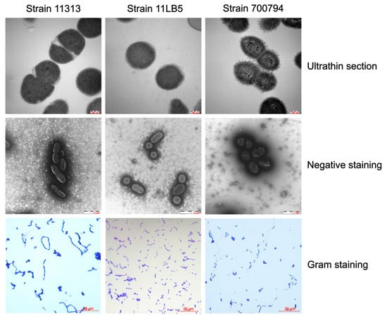 Transmission electron and Gram-staining micrographs of S. suis strains 11313 and 11LB5. S. suis 11313, 11LB5, and reference strains samples were collected for electron micrographs observation by HITACHI H-7650 transmission electron microscope. Ultrathin section, scale bar = 0.2 μm. Negative staining, 11313 and 11LB5, scale bar = 2 μm; 700794, scale bar = 1 μm. Gram staining, scale bar = 20 μm.