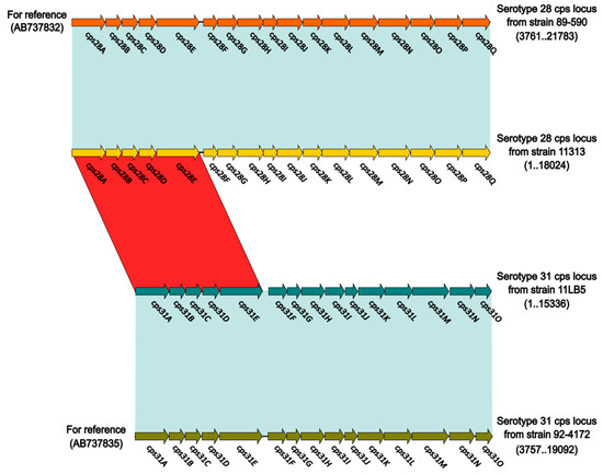 Genomic DNA of strains 11313 and 11LB5 were extracted from overnight cultures using a Bacterial DNA Extraction Kit (Tiangen, Beijing, China), according to the manufacturer’s instruction. The DNA concentration was determined by a Nanodrop 2000 Spectrophotometer (Thermo scientific, Waltham, MA, USA). For two isolates, the whole genomes were sequenced with a paired reads library with an average insert size (125 bp + 125 bp) on a HiSeq 2500 sequencer (Illumina, San Diego, CA, USA). The paired-end raw reads were corrected as clean reads utilizing a FASTX-Toolkit (http://hannonlab.cshl.edu/fastx_toolkit/, accessed on 19 September 2018), and then assembled using Velvet V1.2.03. Gene prediction was performed using Glimmer version 3.0. Predictions of tRNA and rRNA were conducted with tRNAS and RNAmmer, respectively. COG classification was conducted using CDD database and metabolic pathways were built through the KEGG database. Annotation of resistance genes was carried out using the online ResFinder database (https://cge.cbs.dtu.dk/services/ResFinder/, accessed on 17 May 2020). The cps locus sequence comparisons were performed by the software MUSCLE 3.8.31 [15] and BLASTN, respectively. Gene organization diagrams were drawn in the software Inkscape 0.48.1 (https://inkscape.org/en/, accessed on 24 February 2020).