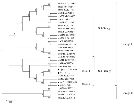 To analyze the evolutionary relationship between strains 11313, 11LB5, and other S. suis strains, we constructed a phylogenetic tree based on the polysaccharide polymerase gene wzy. As shown in Figure 3, strains 11313 and 11LB5 are located on the lineage I of the tree and in the same sub-lineage, but they are in different clusters. The wzy gene from 11313 is included in cluster 1 (closest to cps28L), while 11LB5 is included in cluster 2 (closest to cps31L).