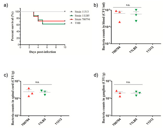 Virulence of S. suis strains 11303 and 11LB5 in a mouse model. Mice were challenged with the indicated strains, as described in Experimental Procedures. (a) Survival rates of mice inoculated with serotype 28 strain 11313, serotype 31 strain 11LB5, serotype 2 reference strain 700794, or Todd Hewitt broth (THB, control). Bacterial loads in (b) the blood (CFU/ml), (c) spinal cord (CFU/g of tissue), and (d) ganglia (CFU/g) of mice inoculated with strain 11LB5 or 700794 were not significantly different (p > 0.05). Results are expressed as means ± SD, and significance was determined using t-test and the unpaired t-test. n.s., not significantly different; green triangle: Strain 11LB5; red triangle: Strain 700794.
