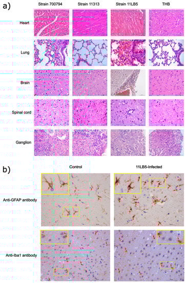 Histopathological lesions were determined in mice that were euthanized on 3 dpi (Figure 5a). In 700794-infected mice, there were no significant pathological changes in the heart and ganglia, but there was mild proliferation of glial cells in the spinal cord, the alveolar diaphragm was slightly widened, and exfoliated epithelial cells could be seen in the bronchus, with a significantly increased glial cells in the brain. However, in the 11LB5-infected mice, there was no significant change in the heart and the spinal cord. The main histopathological lesions observed in the lung were local congestion, a small amount of bleeding, a slight widening of the alveolar diaphragm, and a small number of epithelial cells of the bronchioles falling off. In the ganglia, some nerves were demyelinated and some cell nuclei disappeared. In the infected brains, there was local meningeal thickening, congestion with mononuclear cell infiltration, and increased glial cells could be seen in the cerebral cortex. In the 11313-infected mice, there were no significant pathological changes in any organs as compared with the controls. We performed IHC in order to identify which type of glial cells were increased massively in the cerebral cortex of 11LB5-infected brains. As showed in Figure 5b, there were more than four astrocytes per field of vision in the infected group, but two astrocytes per field of vision in control group. However, there were two microgilas per field of vision both in the infected group and in the control group. Therefore, astrocytes were the type of glial cells that increased massively in the 11LB5-infected brains.