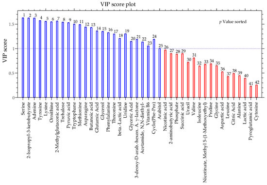 | 31 | Valine, 2TMS (RI: 1230) | 0.810 | 1.35 × 10−1 | ↓= | 1.06 | Amino acid metab. |