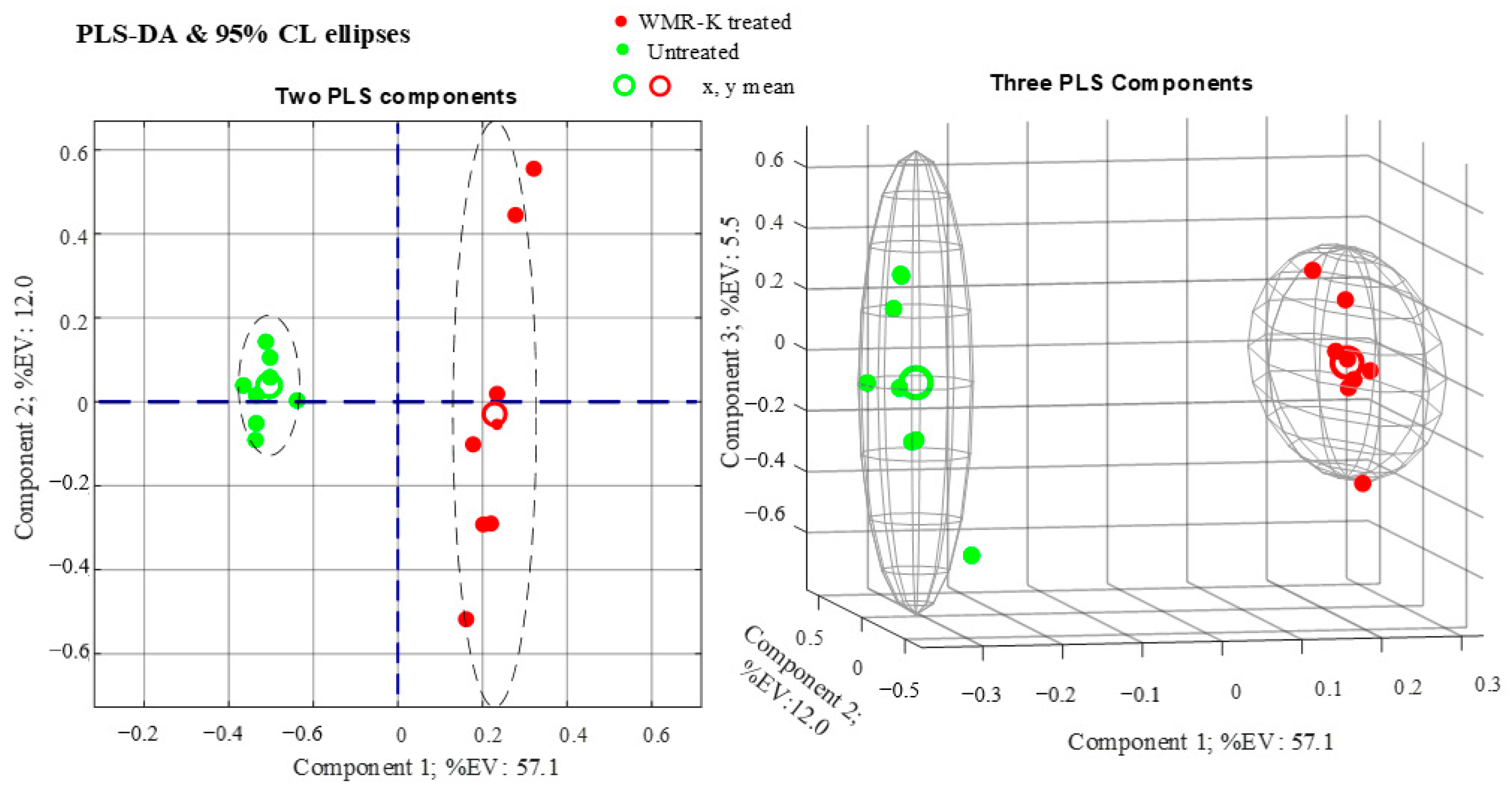 | 3 | Adenine, 2TMS (RI: 1890) | 1.623 | 6.20 × 10−11 | ↓ | 25.75 | Nucleotide and energy metab. |