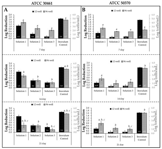 The overall trends of how log reductions and inoculum controls changed between increasing plate incubation times were graphed (Figure 4). For ATCC 30461, the 12-well recovery demonstrated an increase in log reductions between Day 7 and Day 14, followed by no change. In contrast, the 96-well recovery decreased between Day 7 and Day 21, dropping from 1.4 to 0.7 for Solution 1. For ATCC 50370, the greatest change was observed in the inoculum control, which increased from 2.2 to 4.8 between Day 7 and Day 21.