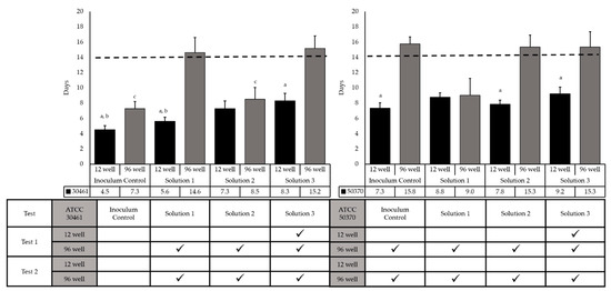 To understand the minimum incubation time needed to obtain accurate final results, the days to final concentration were evaluated for each Solution/Strain/Recovery method combination (Figure 5). For ATCC 30461, the inoculum control recovered statistically faster in the 12-well recovery method than the 96-well recovery method, which was also true for Solution 1 and Solution 3. By comparison, ATCC 50370 recovered statistically faster in the Inoculum Control, Solution 2, and Solution 3 in the 12-well plate versus the 96-well plate. ATCC 30461 had a statistically earlier average day of final concentration for the Inoculum Control for both recovery methods compared to ATCC 50370. The 12-well recovery method reached a final concentration before Day 14 for all strains and solutions tested.