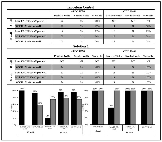 For the 96-well recovery method, 20 µL of the test solution was dispensed into 180 µL of lethicin/polysorbate 80 in quadruplicate across a 96-well plate as described by Kilvington et al. [27]. A multichannel pipette was used to serially dilute the 96-well plates by removing 20 µL of the test solution/lethicin/polysorbate 80 (10−1) and dispensing it in 180 µl of ¼ Ringers solution. Successive dilutions were created across the 96-well plate to the 10−6. Each well was inoculated with E. coli (low 106 CFU/well: 2.2 × 106 CFU) based on methods previously published [27,45,72,81]. Following the addition of E. coli to each well, all 96-well plates were taped and incubated at 28 °C.