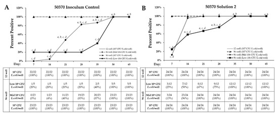 Results show that 96-well recovery and lower E. coli density significantly increase the days to final percent positive rates. Days when individual Acanthamoeba ATCC 30461 trophozoite wells were identified as positive for each recovery method, within (A) Inoculum Control and (B) Solution 2 treatment. The percentage of positive wells was calculated using the total number of wells positive by Day 65 as the denominator and the positive wells positive on a particular day as the numerator. a: p < 0.05 vs. day 7 within the same recovery and E. coli density, b: p < 0.05 vs. Day 14 within the same recovery and E. coli density, c: p < 0.05 vs. 107 CFU/well 96-well, d: p < 0.05 vs. 107 CFU/well 12-well.