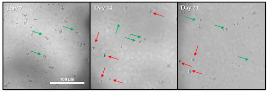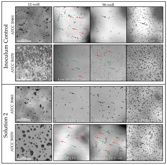Representative images of a Solution 2 well from a 96-well plate containing Low 106 E. coli CFU from ATCC 50370 were captured at 4× magnification. The well was positive at Day 14 as indicated by the red arrows, which indicate all trophozoites present. Scale bar = 100 µm, all pictures taken at the same magnification. Green arrows indicate E.coli. See Figure 6, Figure 7 and Figure 8 for quantification and analysis.
