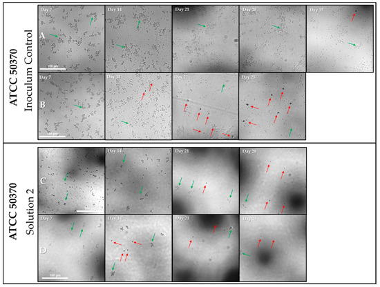 Representative images from ATCC 50370: higher density E. coli results in earlier well positivity. (A,B) Inoculum Control wells from the 96-well containing Mid-106 E. coli CFU from ATCC 50370 were captured at 4× magnification. (A) was positive at Day 35 as indicated by the arrows, while (B) was positive at Day 14. (C,D) Solution 2 wells from the 96-well containing Low 106 E. coli CFU from ATCC 50370 were captured at 4× magnification. (C) was positive at Day 21, while (D) was positive at Day 14. Red arrows indicate all trophozoites present. Scale bar = 100 µm, all pictures taken at the same magnification. Green arrows indicate E.coli. See Figure 6, Figure 7 and Figure 8 for quantification and analysis.