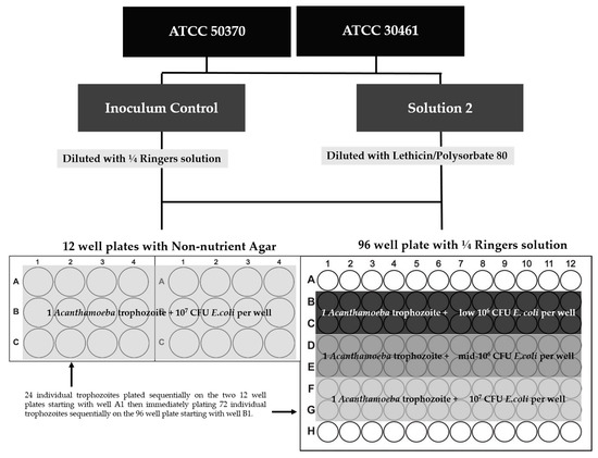 One milliliter of each inoculum control was removed and placed in 9 mL of ¼ Ringers solution and 1 mL inoculated Solution 2 was removed and placed in 9 mL of lethicin/polysorbate 80 to neutralize the biocide. Further dilutions were conducted as needed to adjust the Acanthamoeba concentration for single-cell isolation. These steps were intended to mimic antimicrobial efficacy testing such that the Acanthamoeba trophozoites were treated identically as they were in the antimicrobial efficacy studies until plating where they were diluted and individual trophozoites placed in separate wells.