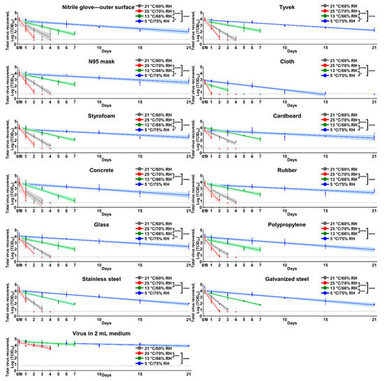 - Kratzel, A.; Steiner, S.; Todt, D.; V’kovski, P.; Brueggemann, Y.; Steinmann, J.; Steinmann, E.; Thiel, V.; Pfaender, S. Temperature-dependent surface stability of SARS-CoV-2. J. Infect. 2020, 81, 474–476. [Google Scholar] [CrossRef] [PubMed]
