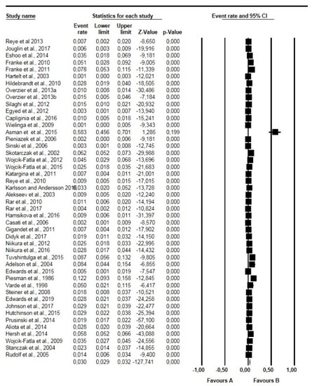 | Portugal | 2 | 438 | 0 | 0.02 (0.00–1.60) | 0.041 | 0.00 | p = 0.839 |