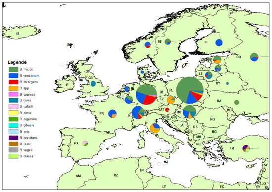 - Schorn, S.; Pfister, K.; Reulen, H.; Mahling, M.; Silaghi, C. Occurrence of Babesia spp., Rickettsia spp. and Bartonella spp. in Ixodes ricinus in Bavarian public parks, Germany. Parasit. Vectors 2011, 4, 135. [Google Scholar] [CrossRef] [PubMed]