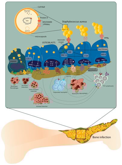 102. Bost, K.L.; Bento, J.L.; Petty, C.C.; Schrum, L.W.; Hudson, M.C.; Marriott, I. Monocyte chemoattractant protein-1 expression by osteoblasts following infection with Staphylococcus aureus or Salmonella. J. Interferon Cytokine Res. 2001, 21, 297–304. [Google Scholar] [CrossRef] [PubMed]
