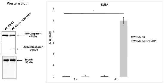 Figure 4. Caspase activation in the MG-63 cell line. Western blot analysis confirmed that the wild type MG-63 cells incubated with lipopolysaccharides and adenosine triphosphate (LPS+ATP) produce active caspase-1. An ELISA was performed to confirm IL-1β production in the WT MG63 cell line and in WT MG-63+LPS+ATP at 2 h and 6 h. The differences were assessed by the analysis of variance (ANOVA). p Values  < 0.05 (*) were considered to be significant (from and modified from Lima Leite et al., 2020).