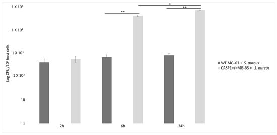 Figure 5. Involvement of caspase-1 in bacterial clearance in WT MG-63 and in CASP1−/− mutant MG-63 at different time points. S. aureus MOI 50:1. Tukey’s Honestly Significant Difference test was applied for comparison of means between the groups. p < 0.01 (**) for the comparison of the number of internalized bacteria in CASP1−/−MG-63 cells with those in WT MG-63 cells, and p values < 0.05 (*) for the comparison of the number of internalized bacteria in CASP1−/−MG-63 cells 6 and 24 h post-infection were considered to be significant (modified from Lima Leite et al., 2020).