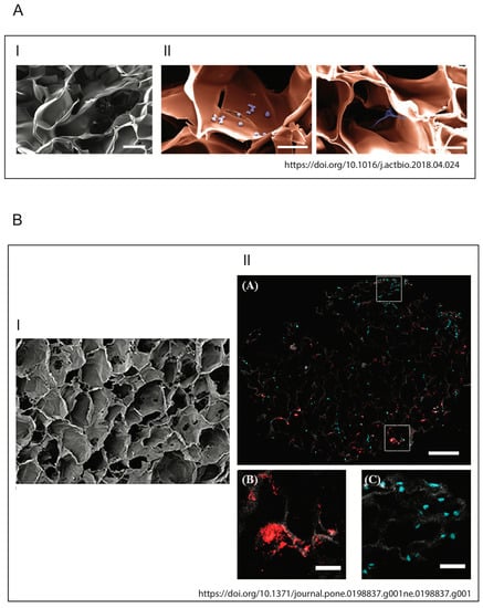 Figure 6. Illustrations of biomimetic 3D in vitro models. (A) Architecture and biocompatibility of the 3D protein scaffold. (I) Pseudocolored SEM picture of a cross section of the applied macroporous 3D protein scaffold. The image shows the porous structure inside the scaffold. Scale bar: 100 mm. (II) SEM image of 3D protein scaffold seeded with the HSPC (left) and MSC (right) cell lines. The cells (violet) are located inside of the pores of the scaffold (orange) and adhere to the scaffold material. Scale bar: 50 mm (Raic et al./Acta Biomaterialia 73 (2018) 250–262). (B) Pore architecture of scaffolds seeded with osteoblasts and infected by S. aureus. (I) SEM of 3D scaffold only (100×, Scale bare 100 μM); (II) qualitative assessment of cellular and bacterial co-infiltration of the collagen scaffold (from Kavanagh et al., 2018).