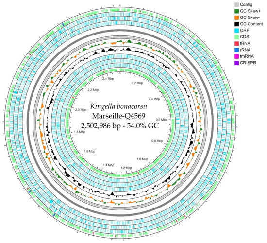 The genome size of strain Marseille-Q4569T was 2,502,986 bp long with a 54.0% G+C content. The genome assembly was achieved on 9 contigs with a mean coverage of 36.0. It was deposited into GenBank under the accession number JAEHNZ000000000. Of the 2698 predicted genes, 2556 were protein-coding genes, 71 were RNAs (4 5S rRNA, 4 16S rRNA, 4 23S rRNA, 55 tRNAs and 4 ncRNA), and 71 were pseudo genes. Genes with putative function (by clusters of orthologous groups, COGs) were 1353 for Kingella bonacorsii strain Marseille-Q4569T (Table 3). Finally, 1177 genes (43.6%) were annotated as hypothetical proteins for strain Marseille-Q4569T. A circular map showing a complete view of the genome of strain Marseille-Q4569T is shown in Figure 4.