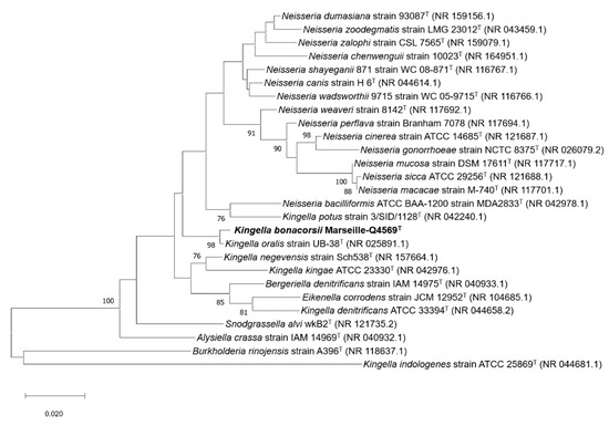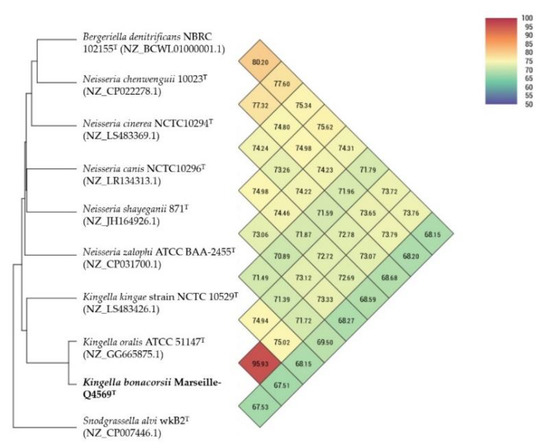 The genome of strain Marseille-Q4569T was compared to the available genomes of nine closely related bacterial strains. The genome size of our strain (2.50 Mb) was larger than that of N. cinerea, K. kingae, B. denitrificans, N. shayeganii, K. oralis, N. zalophi and N. chenwenguii (1.83 Mb, 2.00 Mb, 2.32 Mb, 2.35 Mb, 2.40 Mb, 2.42 Mb, 2.49 Mb, respectively), but smaller than that of S. alvi (2.52 Mb) and N. canis (2.56 Mb). The G+C content of our strain (54.0%) was equal to or higher than that of all strains compared, with the exception of K. oralis (54.3%), B. denitrificans (55.8%) and N. shayeganii (56.4%). When performing digital DNA–DNA hybridization (dDDH) analysis, strain Marseille-Q4569T exhibited values ranging from 63.6 (60.7–66.4)% with K. oralis to 22.2 (19.9–24.6)% with N. canis (Table 4).