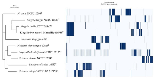 Pangenome analysis of strain Marseille-Q4569T whole-genome sequences. A maximum likelihood tree was constructed from the accessory genome elements (left). The presence (blue) and the absence (white) of accessory elements of the genome are presented on the right.