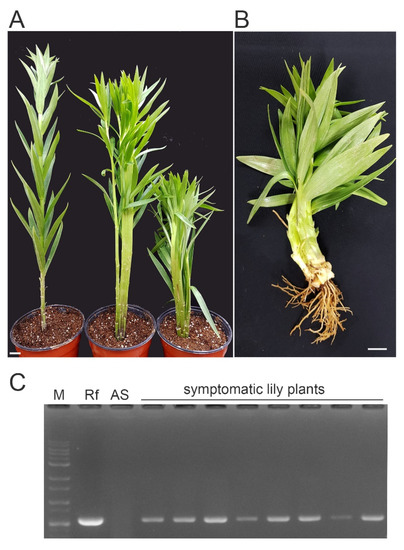 Typical phenotypes of symptomatic hybrid lily plants. (A) Multiple inflorescences with flattened stem lilies (middle and right) compared with those of an asymptomatic plant (left). (B) Plant exhibiting severe stunted growth with flat twisted stems. Bar, 1 cm. (C) PCR amplification of fasD. Total DNA from the asymptomatic (AS) and symptomatic lily plants was used as the template. The fasD amplicon size is 573 bp. M, molecular weight marker; Rf, positive control for R. fascians (Loewe Biochemica GmbH); AS, asymptomatic lily plant.