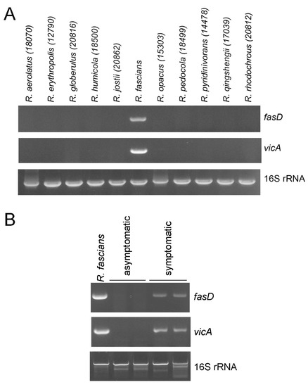 (A) Evaluation of PCR primers for vicA. Total bacterial DNA was isolated from Rhodococcus species obtained from the South Korean Agricultural Culture Collection (KACC) microbial stock center (Rural Development Administration, South Korea). Numbers indicate the KACC accession numbers. (B) Bacterial DNA was isolated from asymptomatic and symptomatic lilies. The positive control for R. fascians was purchased from Loewe Biochemica GmbH. The fasD, vicA, and 16S rRNA genes were PCR-amplified using PCR primers (Supplementary Table S2). The experiments were repeated at least three times, and representative results are shown.