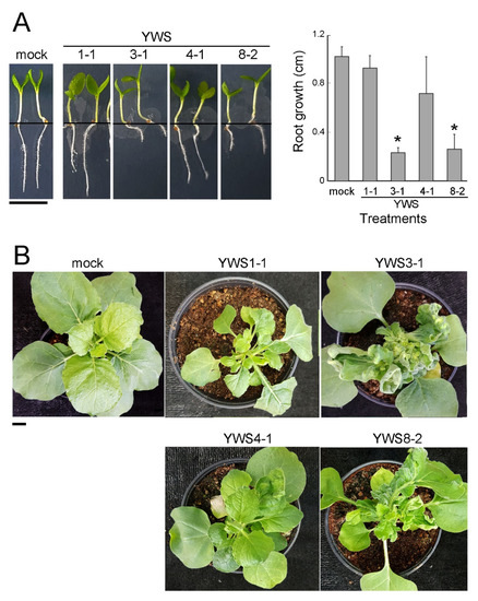 To verify the pathogenicity of the isolated strains using N. benthamiana [19], we selected isolates YWS1-1, YWS3-1, YWS4-1, and YWS8-2 as representative strains according to the vicA-based phylogenetic analysis (Figure 3). Infection of N. benthamiana seedlings with YWS3-1 and YWS8-2 significantly stunted root growth (p ≤ 0.05), whereas inoculations with isolates YWS1-1 and YWS4-1 did not alter growth compared with that of mock-treated control seedlings (Figure 4A). Similarly, the meristems of tobacco plants inoculated with YWS3-1 and YWS8-2 exhibited the typical symptoms of leafy gall, including multiple proliferation of deformed leaves, foliar distortion, and generation of adventitious tissue (Figure 4B). On the other hand, YWS1-1 and YWS4-1 induced less severe symptoms than the other two strains, and they delayed growth and weakened the dominance of the shoot apex compared with mock-inoculated control plants. These symptoms were more pronounced for YWS1-1 than for YWS4-1 (Figure 4B). The bacteria were re-isolated from symptomatic N. benthamiana plant tissues, and vicA PCR analysis confirmed that they were the same bacteria as the inoculated bacteria (data not shown).