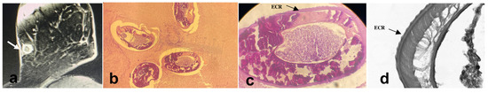 (a) A computed tomography scan showing a nodule in the left breast (case 8); (b) Cross-sections of D. repens, showing different diameters in the same subject, cut at different level of the worm; external cuticular ridges (ECR) are well visible (40×, H/E) (case 2); (c) A closer view of the section and of the typical longitudinal ridges of the D. repens cuticula (d) (case 2).