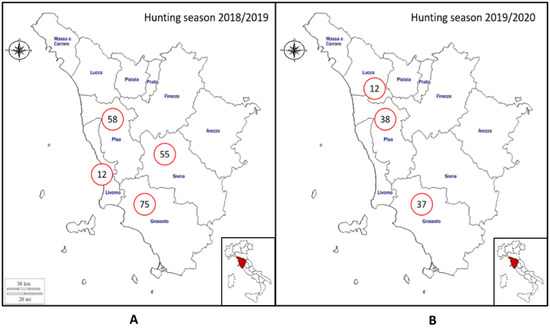 - Bertelloni, F.; Mazzei, M.; Cilia, G.; Forzan, M.; Felicioli, A.; Sagona, S.; Bandecchi, P.; Turchi, B.; Cerri, D.; Fratini, F. Serological survey on bacterial and viral pathogens in wild boars hunted in tuscany. Ecohealth 2020, 17, 85–93. [Google Scholar] [CrossRef]