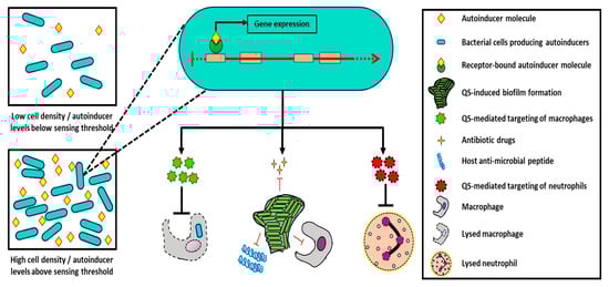 Quorum sensing (QS) is a bacteria’s communicating system wherein they utilize small hormone-like molecules, referred to as autoinducers, to coordinate population behavior in response to the changing environment [12]. These communicating systems can regulate genetic expressions and enable intraspecies interactions as discussed in this section [13,14]. QS-mediated intraspecies interactions have been shown to change the course of host infection by regulating virulence factors that impact the ability of pathogens to evade host immune responses (Figure 1).