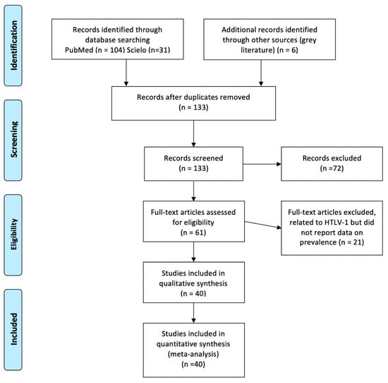 The electronic search in PubMed and SciELO yielded 135 records, while a further 6 studies were identified from other sources. After screening the abstracts, we examined the full text of 61 potentially relevant papers, excluding 21 that did not report data on HTLV-1 prevalence. Therefore, the total number of included papers was 40 studies, plus the present study (Figure 1). Figure 1 shows the flow chart for study selection.
