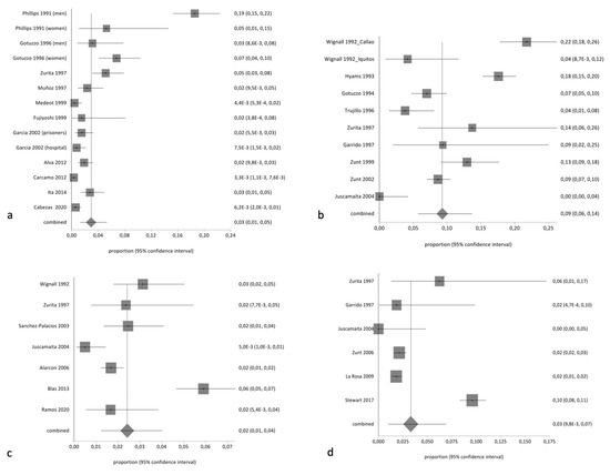 We performed a proportion meta-analysis, using the Stuart-Ord (inverse double arcsine square root) method to calculate the 95% coefficient intervals and create the forest plots. Heterogeneity was analyzed using the I2 statistic (StatsDirect Statstical software v. 3.3.4) [64]. The prevalence meta-analysis was presented according to six population groups: (1) general population, (2) pregnant women or women of childbearing age, (3) sex workers, (4) people with HIV infections, (5) MSM, (6) relatives or descendants of people infected with HTLV, (7) people with Strongyloides infections, (8) people with tuberculosis, and (9) blood donors. We use a random-effects (inverse variance) method.