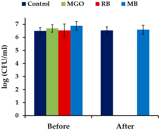 Stock solutions of RB, MGO, and MB hydrate (Sigma-Aldrich, St. Louis, MO, USA) in water were prepared at the concentration of 4.5 mM. Aliquots of the stock solutions were added to 10 mL of Candida albicans suspension at the concentration of 2–8 × 106 cells/mL in a Petri dish, to achieve a final PS concentration of 500 μM. In some experiments, RB and MGO solutions were added to 10 mL of Candida albicans suspension to obtain final concentrations of 50, 250, or 500 μM. The cell suspensions with MB were exposed to light for 4 h, and samples with RB and MGO were exposed for 0.5, 1, 2, 3, and 4 h, using an 18 W white luminescent lamp with an emissions range of 400–700 nm, providing a light intensity of 1.9 ± 0.1 mW/cm2 at ambient temperature. Illuminance was measured by a LX-102 light meter (Lutron, Taipei, Taiwan). After irradiation, 100 μL aliquots of each sample in 3–4 decimal dilutions were spread over YM agar plates with a Drigalsky spreader, incubated at 37 °C overnight, and then the colony-forming units (CFU) were counted. These experiments aimed to test the photodynamic character of the PS activity compared to activity without exposure to light. In the control experiments, samples of Candida albicans suspension without addition of PS were used.