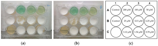 A similar experiment was performed using MGO, and the results showed that this PS also totally inhibited the growth of Trichophyton rubrum at 50 μM, but unlike RB, there was no difference between the results obtained under illumination and in the dark (Figure 5a,b, respectively). Figure 5c presents the layout of wells in this experiment. Since the effect of MGO on fungal cells could not be assigned to its photodynamic activity, the study was continued using only RB as a PS.