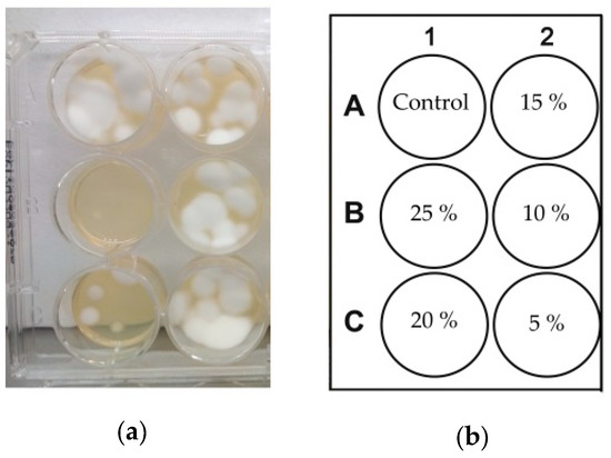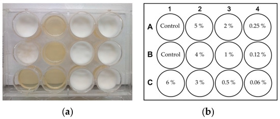 Effect of glycerol/water (70/30%, w/w) solutions of RB at various concentrations on growth of Trichophyton rubrum on YM agar, (a) under illumination of 1.9 ± 0.1 mW/cm2 for 30 min. A layout of wells (b): control wells A1, B1, and C1—untreated culture of Trichophyton rubrum; the remainder—agar medium with applied glycerol/water solutions of RB at concentrations specified in the scheme.