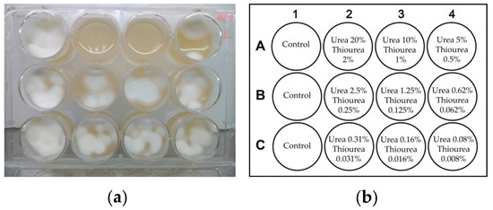 Effect of RB, urea, and thiourea at various concentrations in glycerol/water (70/30%, w/w) solutions on the growth of Trichophyton rubrum on YM agar: (a) under illumination at 1.9 ± 0.1 mW/cm2 for 30 min and (b) in the dark. A layout of wells (c): control wells A1, B1, and C1—untreated culture of Trichophyton rubrum; the remainder—agar medium with applied glycerol/water solutions of RB, urea, and thiourea at concentrations specified in the scheme.