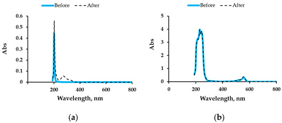 Two solvents were used to prepare eight solutions; four of them were water-based (samples 1–4) and four were based on a glycerol/water (70/30%, w/w) mixture (samples 5–8). Table 1 presents the prepared solutions, containing 0.1 g of each compound (urea, thiourea, or RB, and the three compounds together) dissolved in 10 mL of each solvent. All the solutions were incubated under shaking at 200 rpm for 32 days at 30 °C in the dark. Aliquots of 100 µL from each solution were sampled at the beginning of the experiment, and after 4, 7, and 32 days of incubation. Before examination, the samples were diluted with water, and their spectra were then registered using a 1 cm quartz cuvette in the range of 190–1100 nm with steps of 2 nm. Further monitoring of the solutions was performed at wavelengths of maximal absorption λmax (Table 1).