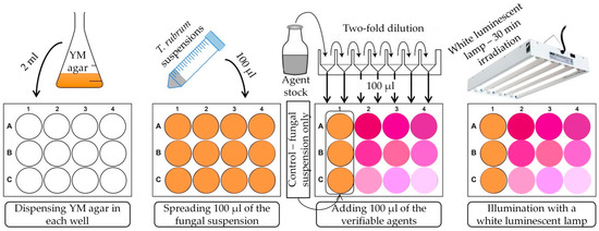 The schematic presentation of experiments in the photodynamic treatment of Trichophyton rubrum is shown in Scheme 1. First, 2 mL portions of YM agar were dispensed into each well of a 12-well plate. After hardening of the agar medium, 100 µL aliquots of Trichophyton rubrum suspension were added on the surface. After that, 100 µL of PS solutions, in water or in a glycerol/water (70/30%, w/w) mixture, were applied to the surface after two-fold dilutions. In the case of water solutions, the final concentration in those added onto the agar surface ranged between 800 to 3.12 µM for RB, 200 to 0.78 µM for MGO, 25% to 5% (w/v) for urea, and 7% to 0.06% (w/v) for thiourea. In the case of glycerol/water solutions, the final concentration on the agar surface ranged between 800 to 3.12 µM for RB, and 20/2% to 0.078/0.008% (w/v) for urea/thiourea. The concentration in the three-component formulation (RB/urea/thiourea) was between 150 µM/5%/0.5% and 0.6 µM/0.02%/0.002% (w/v), respectively.
