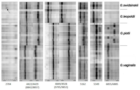 In this study, the peak at m/z 2704 proposed as a unique mark to differentiate G. leopoldii and G. swidsinskii species [13] was observed as a very faint peak (indicated by the arrow in Figure 2). Any other peaks suitable for separation of these two species were not determined. Further, the log(score) based routine identification (Table S2) showed the same result.