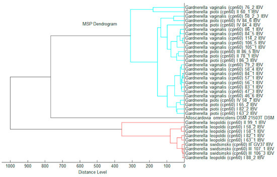 Thus, the cpn60-based approach showed the capability to separate G. vaginalis, G. piotii/genome species 3, G. swidsinskii, and G. leopoldii species (Figure 1). However, the dendrogram of the MALDI-TOF MS profiles generated using the MALDI Biotyper differentiated the phylogenetically diverse groups composed of species of G. vaginalis/G. piotii and G. leopoldii/G. swidsinskii (Figure 3). The fact that G. vaginalis and G. piotii were not distinguished implies the close relatedness of these species in the genus at the proteome level.
